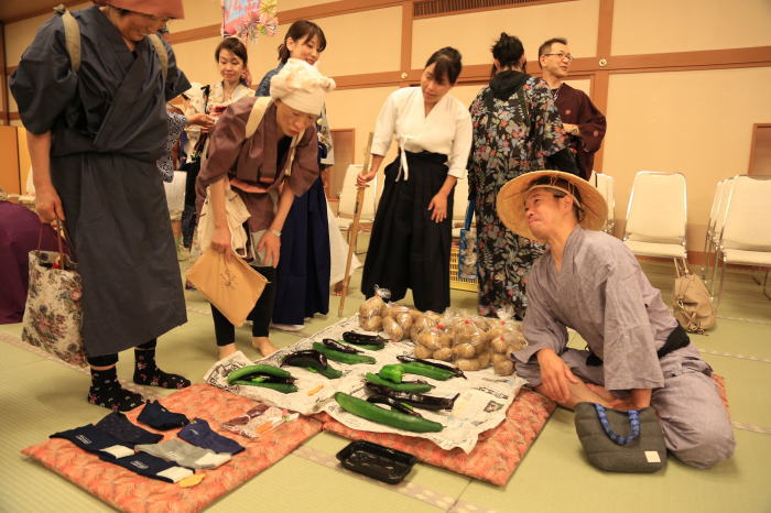 各県で特産品を持ち寄り楽市楽座で江戸時代の雰囲気味わっている。広島は、家庭菜園の野菜好評で完売!!