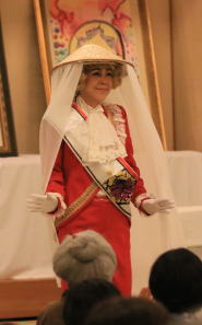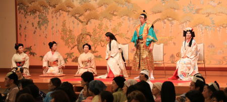 どこかの武将の宴のようです。美しく着飾った女性たちがおすまししてます。