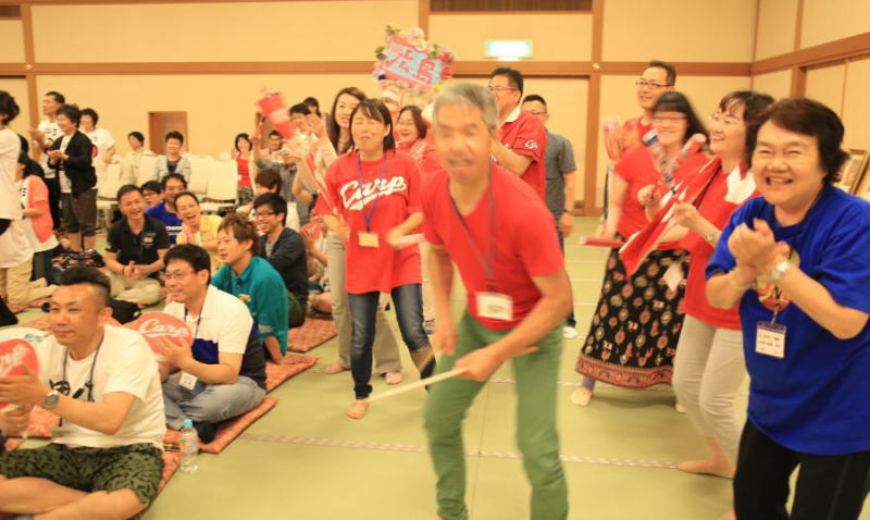 琵琶湖研修では、皆が参加して楽しめる工夫がされています。各県代表者が野球拳で競い、広島は惜しくも初戦敗退。カープ色で応援!